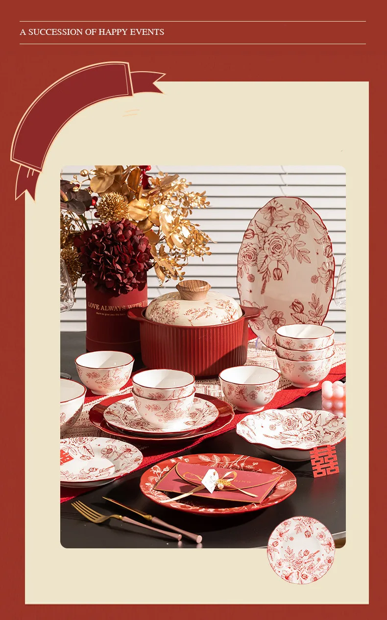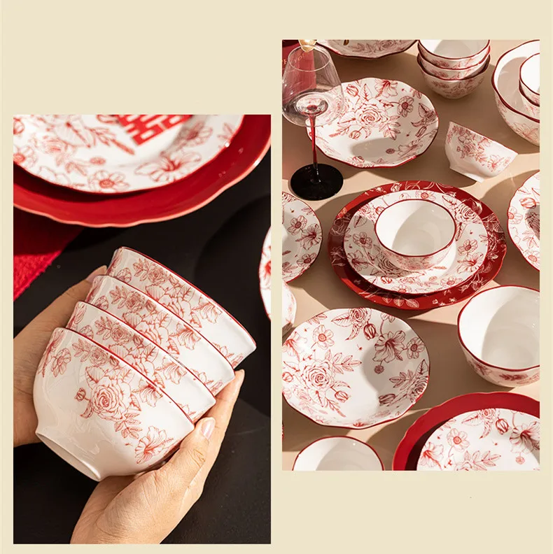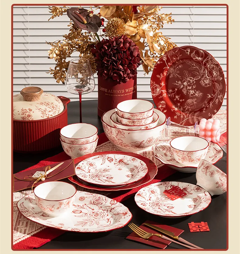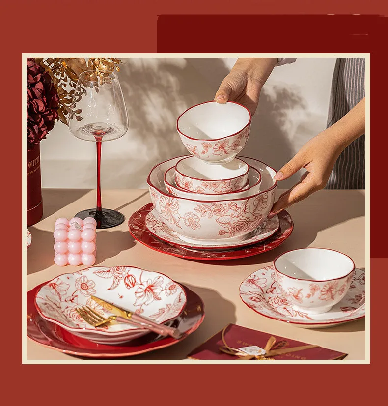 1Set New Luxury Red Rose Ceramic Tableware Household Bowl Spoon Plate Dinner Dinsh Kitchen Cutlery Home Decor