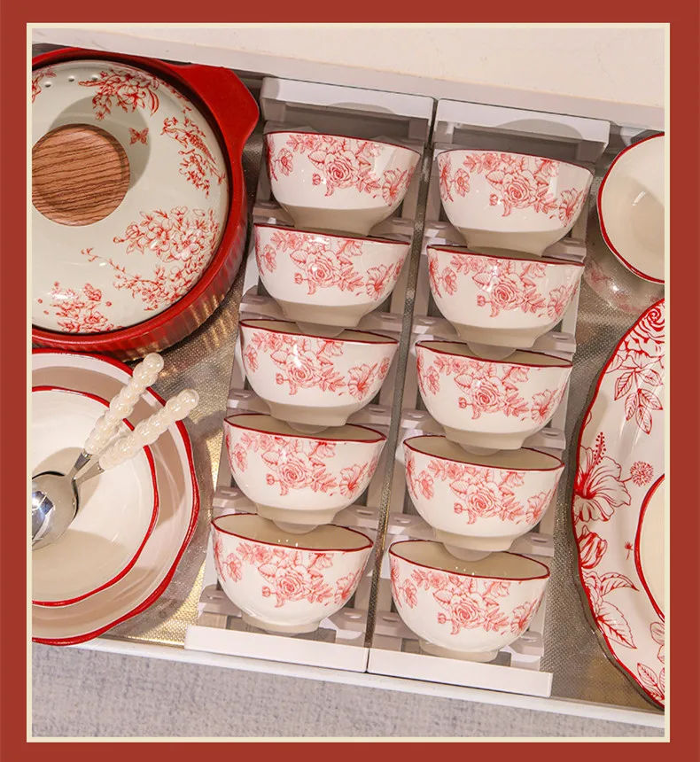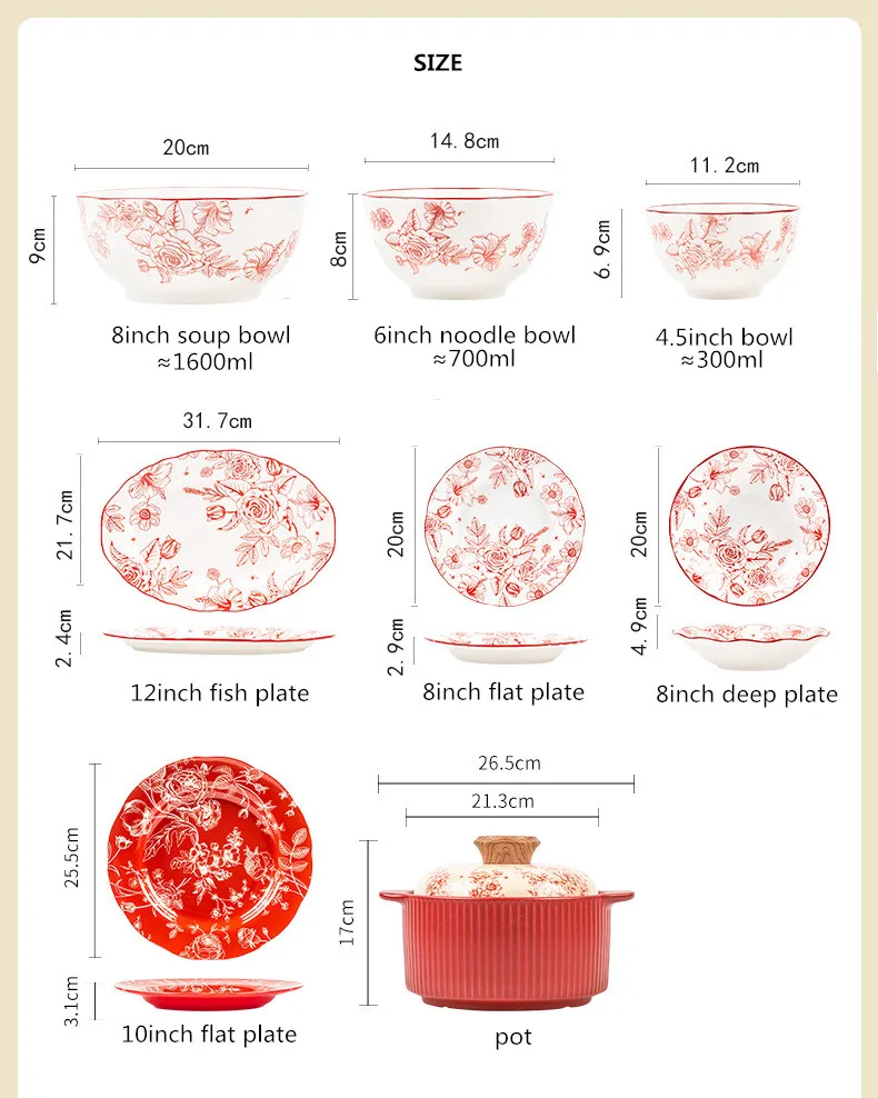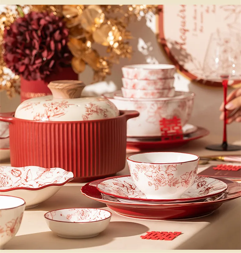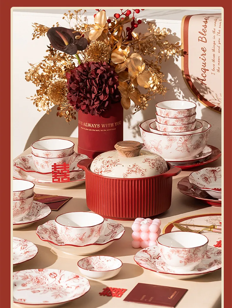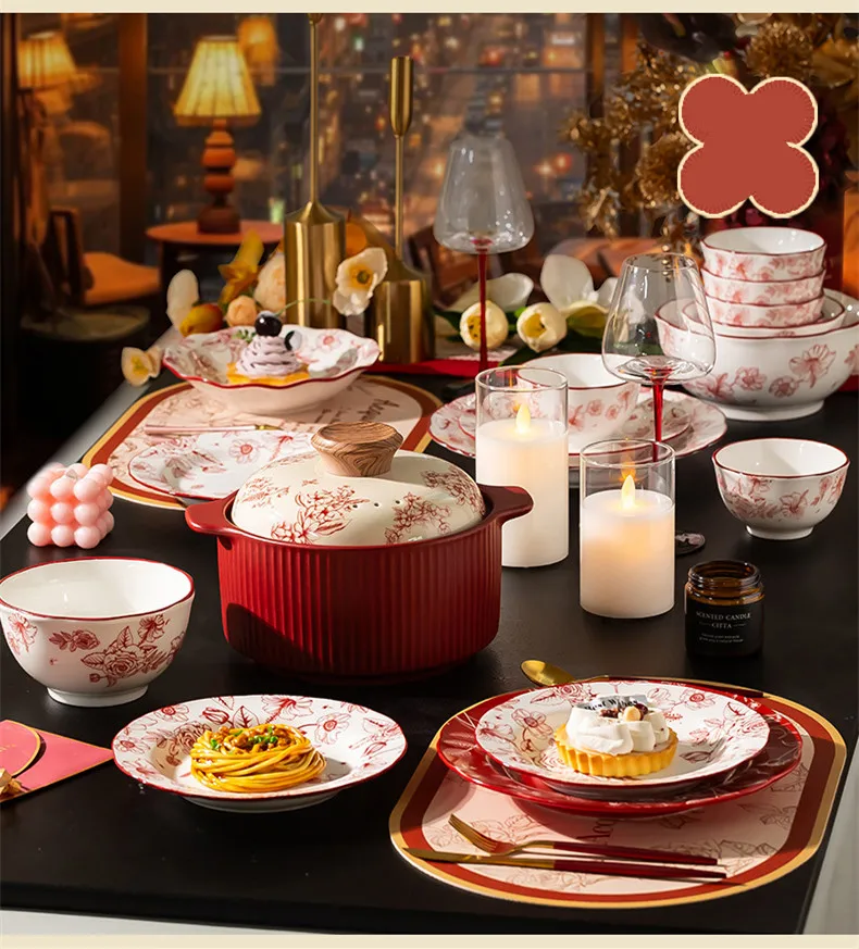 1Set New Luxury Red Rose Ceramic Tableware Household Bowl Spoon Plate Dinner Dinsh Kitchen Cutlery Home Decor
